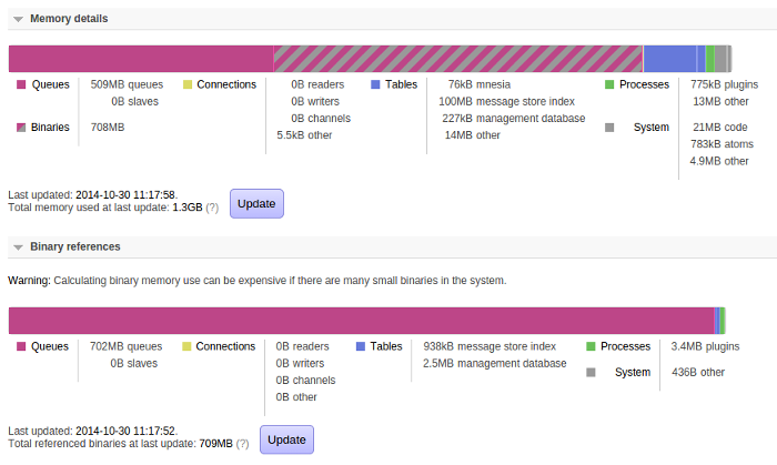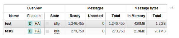 OK, but which queues are using all that memory? We can investigate that by looking at the details page for each queue (this information is of course also available via rabbitmqctl but pictures are nicer to look at):